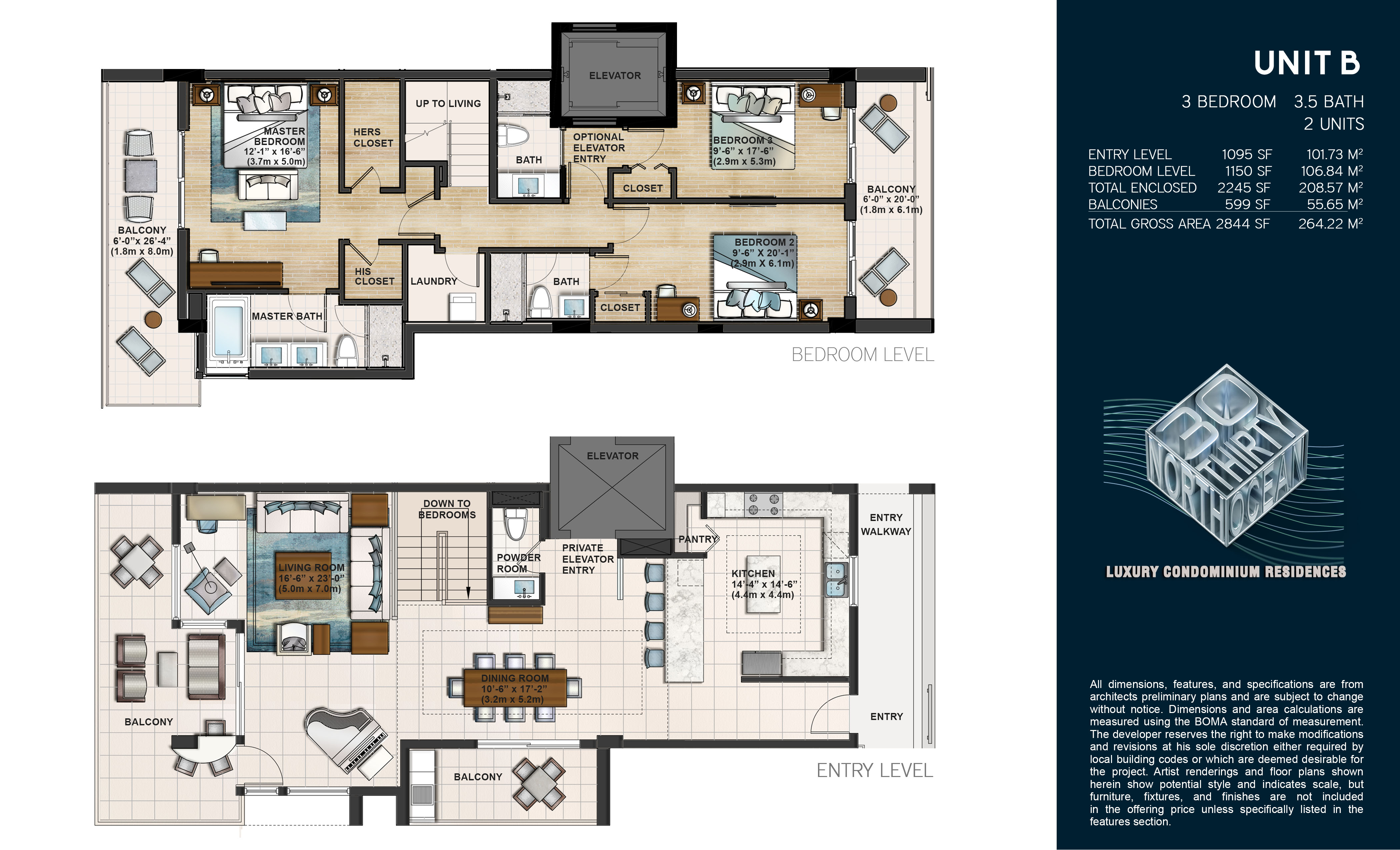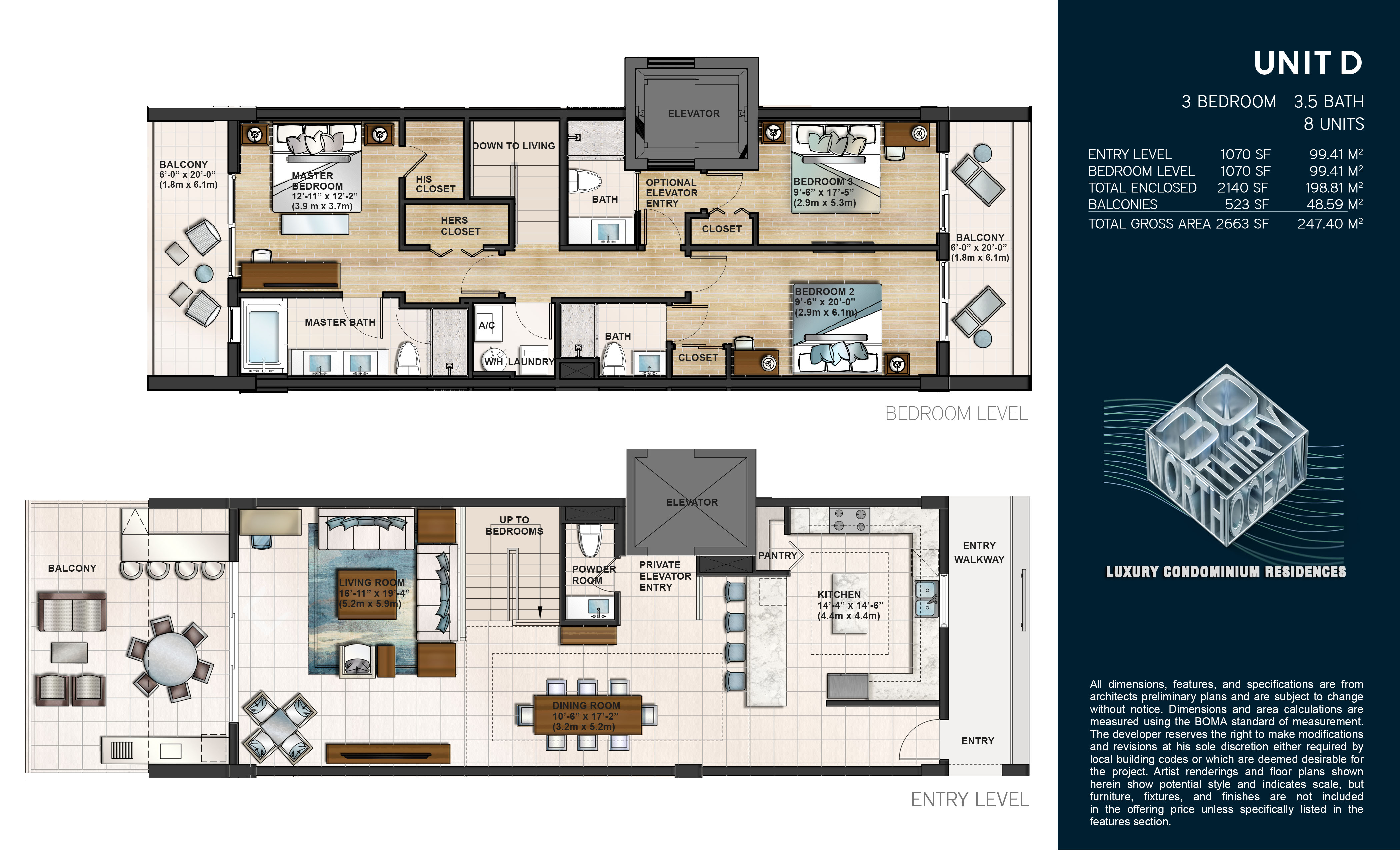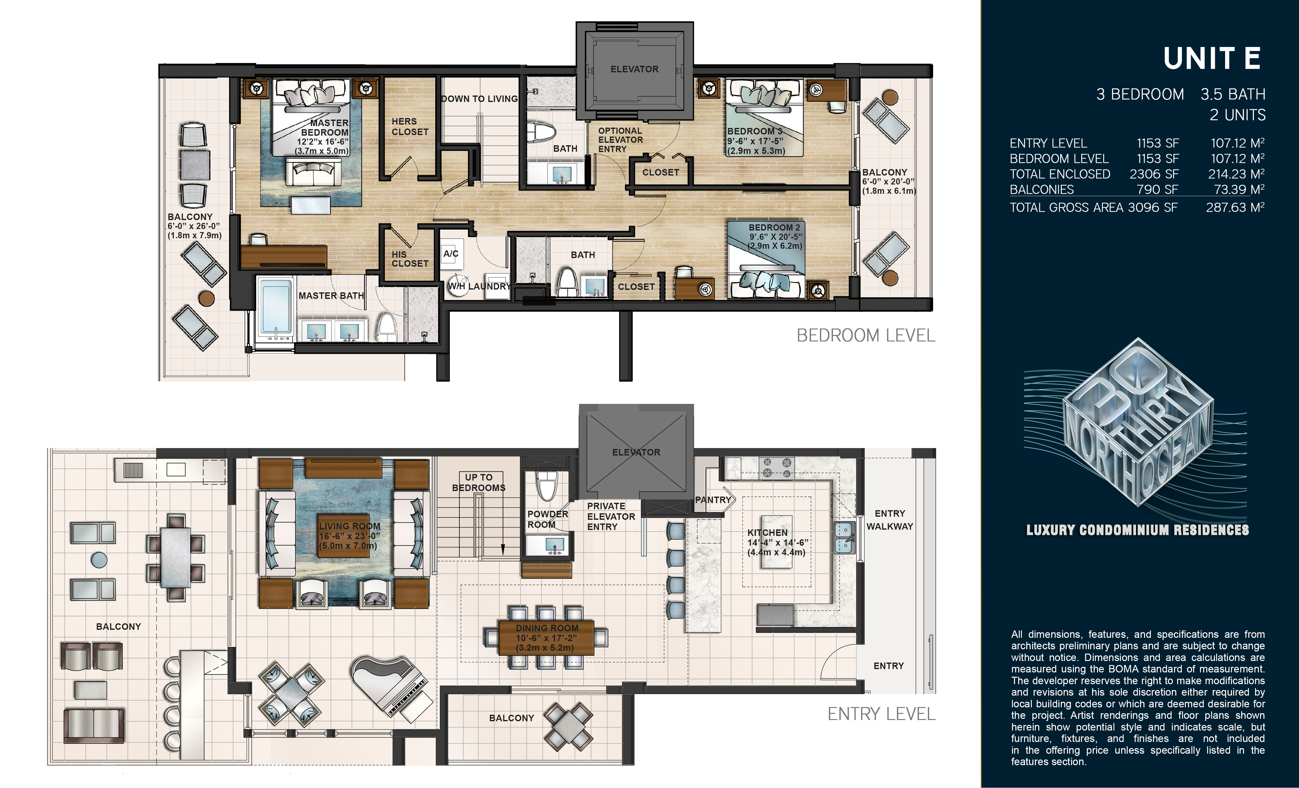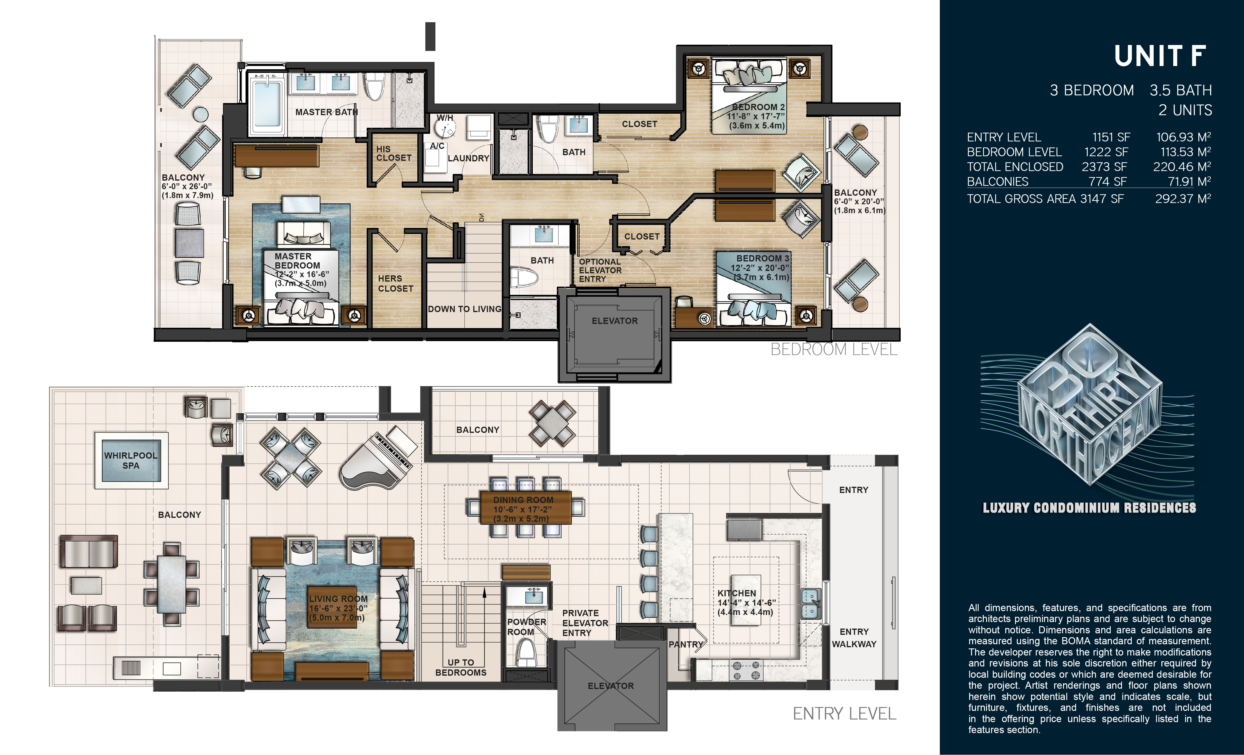 3 bedroom 3 ½ bathroom residences (various plans to choose from)